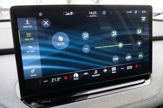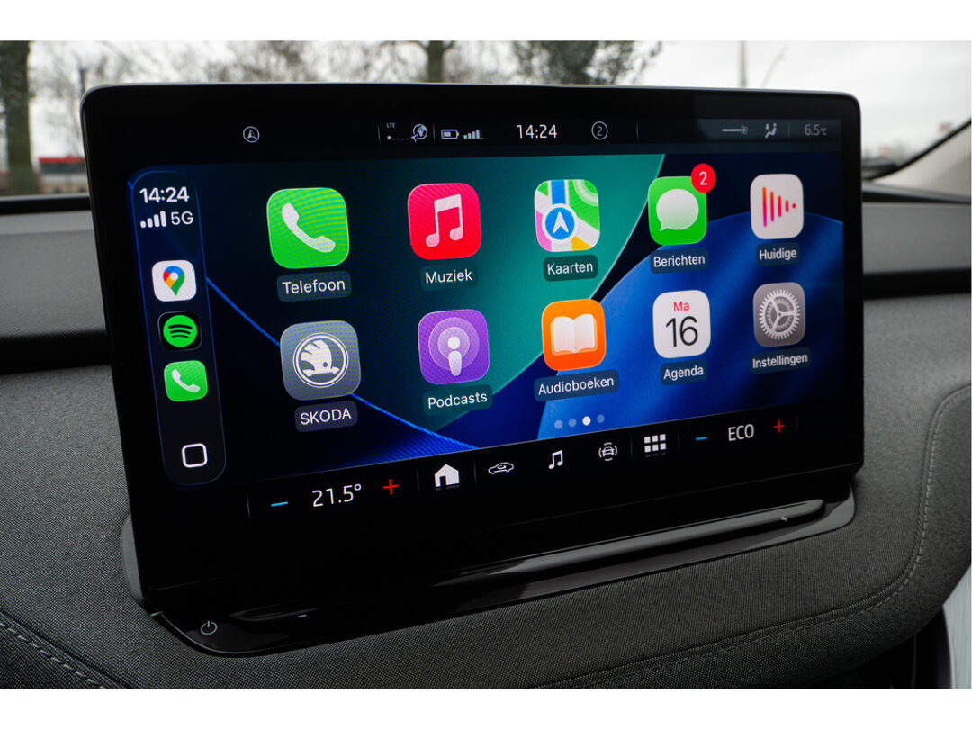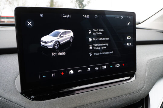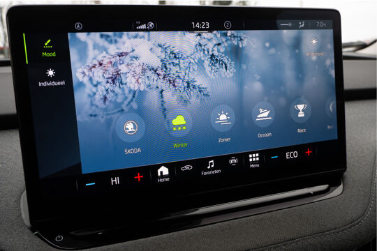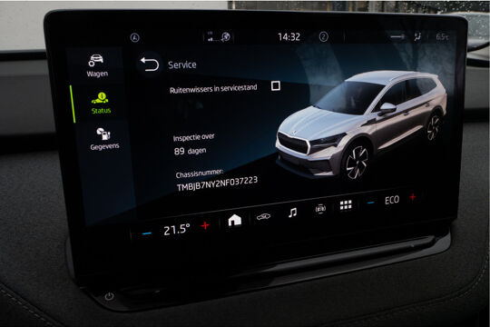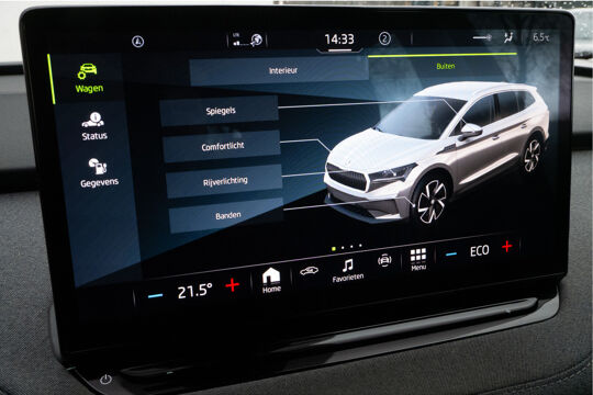 Het rijden met deze ŠKODA wordt nog meer ontspannen dankzij de innovatieve technieken die onderweg over uw veiligheid waken. Deze ŠKODA Enyaq iV is ook behulpzaam als het gaat om een rechte koers. Het Lane-keeping systeem signaleert en corrigeert als u onbedoeld de rijstrooklijnen dreigt te overschrijden. Mindert een voorligger onverwachts te veel vaart, dan komt de forward collision warning in actie en waarschuwt meteen. Ook helpen het autonoom remsysteem en bandenspanningcontrolesysteem, uw rit tot een veilige rit te maken.