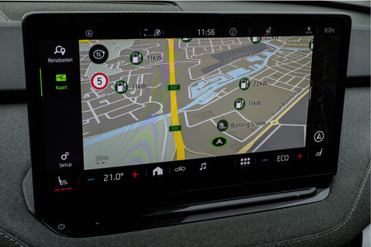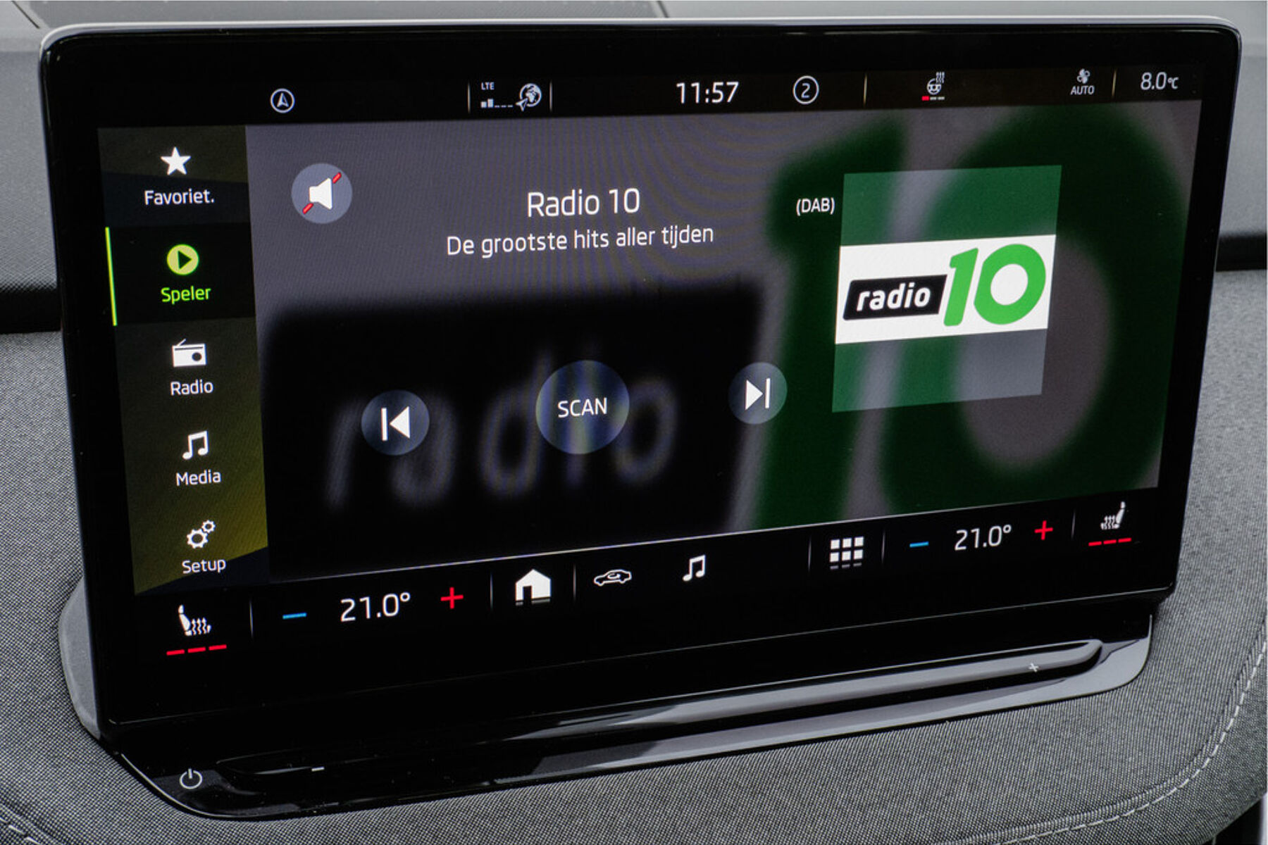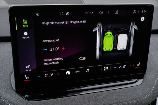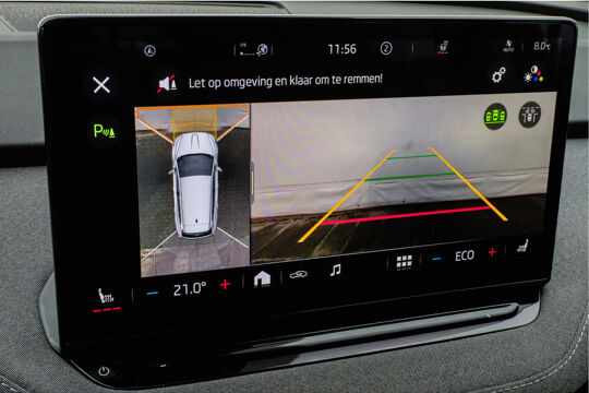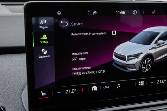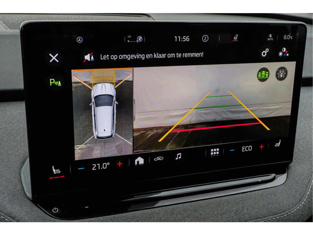 Zoals u mag verwachten van deze ŠKODA Enyaq iV is hij uitgerust met een reeks aan actieve veiligheidssystemen. Het Lane-keeping systeem registreert permanent of u binnen de lijnen van de rijstrook blijft; dwaalt u onbedoeld af, dan waarschuwt het systeem en corrigeert de koers. Forward collision warning waarschuwt bij een dreigende aanrijding en vermindert de gevolgen van een ongeval. U bent mede dankzij head-up display, autonoom remsysteem en bandenspanningcontrolesysteem steeds veilig onderweg.
