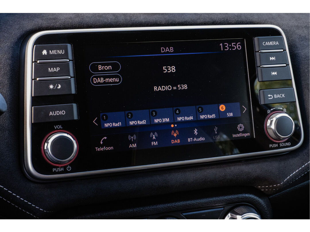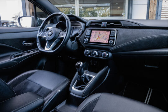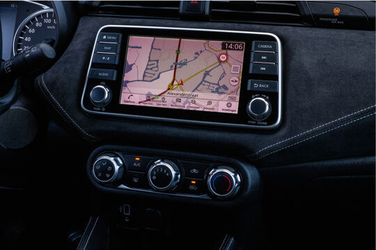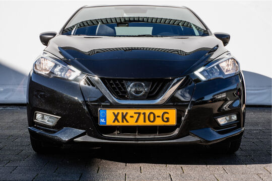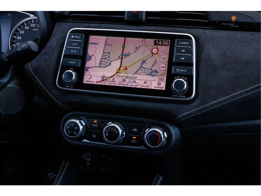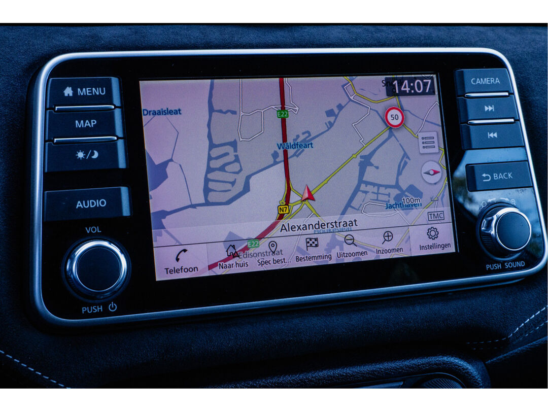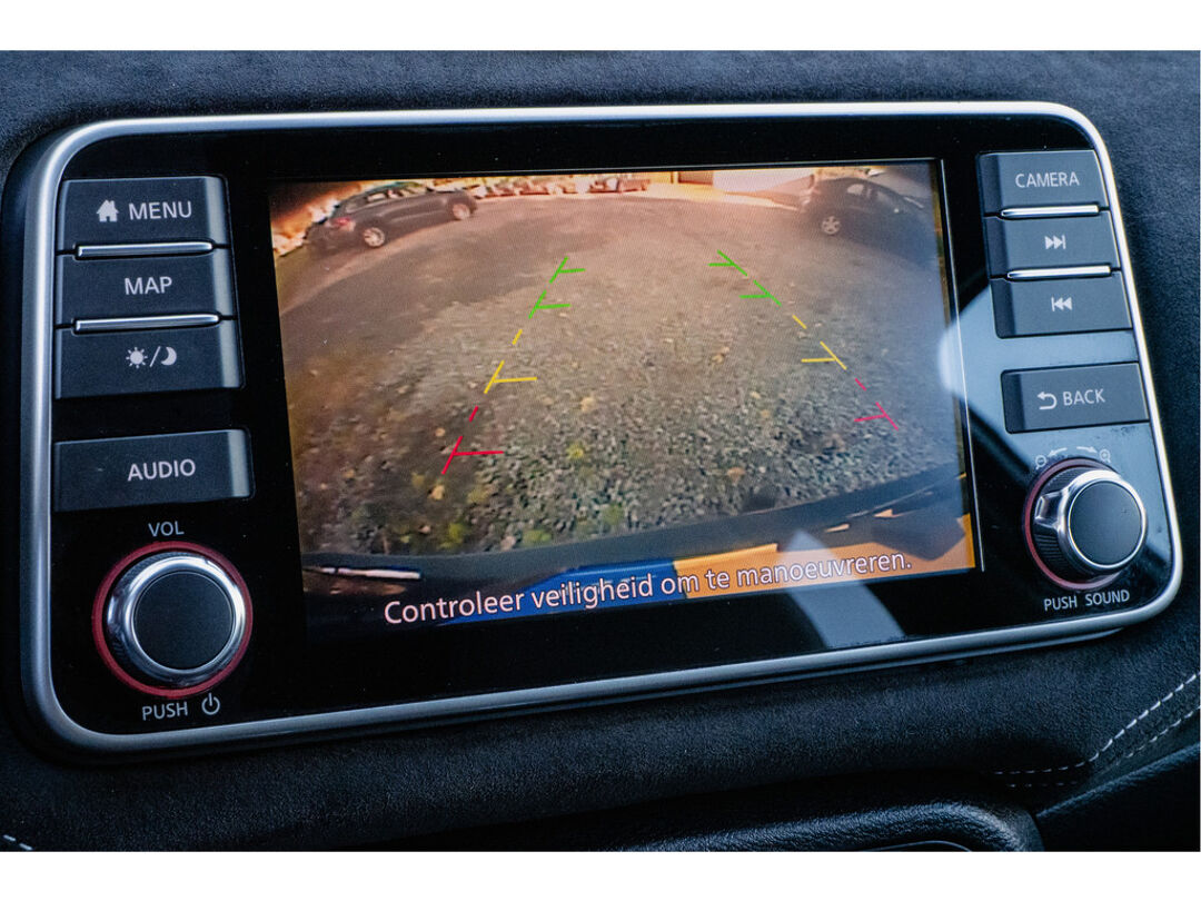 Kom maar, kom maar, kom maar... ho! Prettig hoor, zo'n achteruitrijcamera. U kunt uw handen aan het stuur houden en uw ogen op de weg. Want het audiosysteem, met DAB-ontvangst, en het full map navigatiesysteem bedient u vanaf het stuurwiel. Ook over uw schouder ziet u onderweg niet alles wat er aan de achterzijde gebeurt. Daarom heeft deze Nissan Micra een achteropkomend verkeer waarschuwing. De aanwezige cruise control scheelt lekker in brandstofkosten. En ook bij de flitspaal. De sensor van de keyless entry herkent u op korte afstand en ontgrendelt de portieren automatisch. Ook airconditioning, automatisch dimmende binnenspiegel, boordcomputer en verstelbaar stuur zijn aan boord.